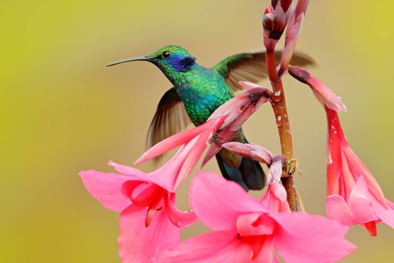 Kolibris ernähren sich vor allem von Blütennektar, fressen aber auch kleine Insekten. Die winzigen Vögel können in der Luft stehen bleiben und so im Flug Nektar aus der Blüte holen. Dazu nutzen sie ihre lange Zunge. Mit ihr können sie den Nektar wie mit einem Trinkhalm aus der Blume saugen.